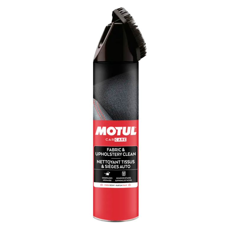 MOTUL CAR CARE FABRIC CLEAN - очиститель для текстильных элементов салона автомобиля. Средство предназначено для удаления пятен и загрязнений с обивки, ковров и других тканевых поверхностей в салоне. После обработки остается приятный аромат. Формат продукта - спрей со встроенной щеткой.