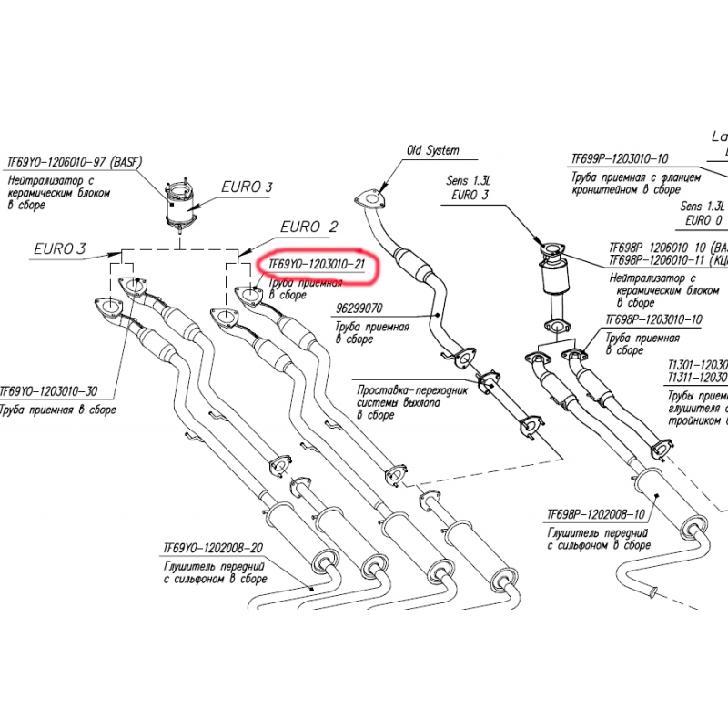 Для Ланосів з моторами 1.5 виробленим за стандартом Євро 2 з нейтралізатором (каталізатором), встановленим вертикально перед приймальною трубою, зонд лямбда встановлений у випускному колекторі. Приймальна труба сполучається з резонатором Євро 2 (під фланець). Виробник Босал – ЗАЗ. На скріншоті номер труби обведений червоним. Старий номер у каталозі TF69Y0-1203010-21 повністю взаємозамінний з номером TF69Y0-1203010-22.
