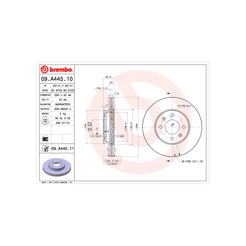 Оригинальный код 09.A445.10 полностью совпадает с каталожным номером производителя Brembo.