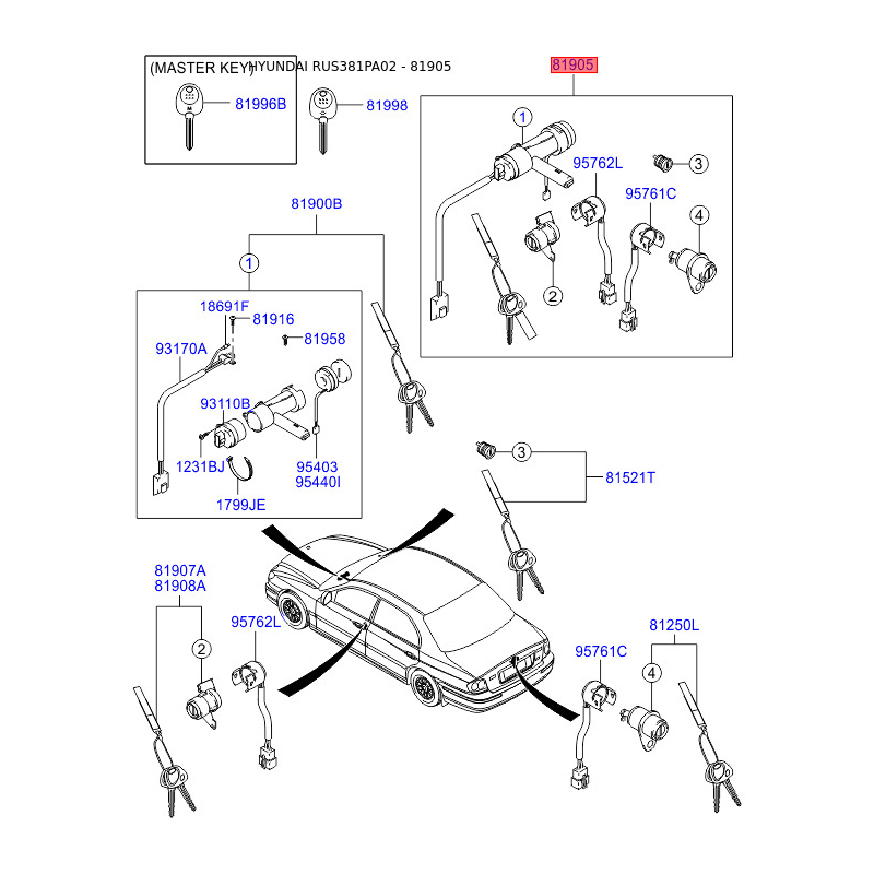 Замок (цилиндр) зажигания с ключами 81905-3D071 Mobis
