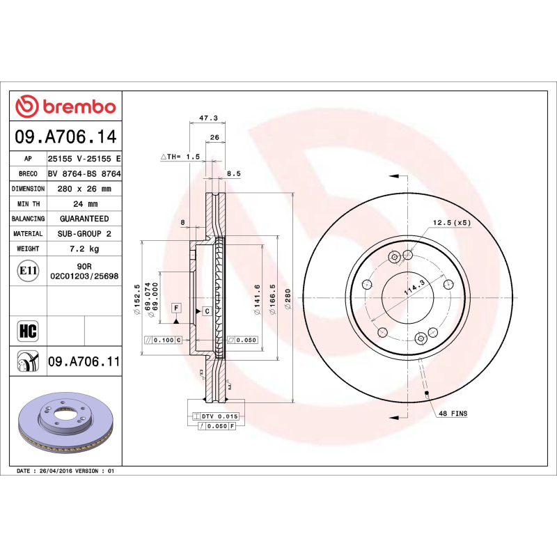 Оригинальный код 09.A706.11 полностью совпадает с каталожным номером производителя Brembo.