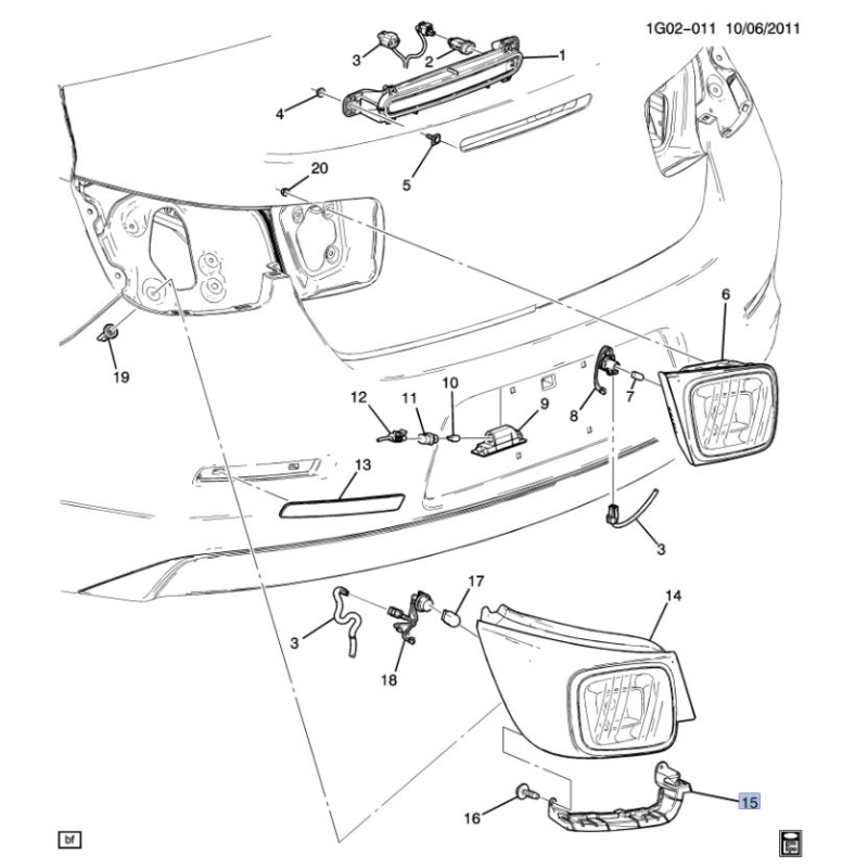 Кронштейн заднего бампера под наружный фонарь левый на Шевроле Малибу (Chevrolet Malibu) 8-го поколения (с 2012 по 2016 год выпуска).
