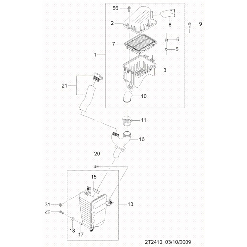 Пистон (клипса) крепит защиту горловины бензобака Ланос (96351534) - фото 4 позиция 12 и резонатор воздуха Авео Т200, 250, 255 - фото 5 позиция 31.